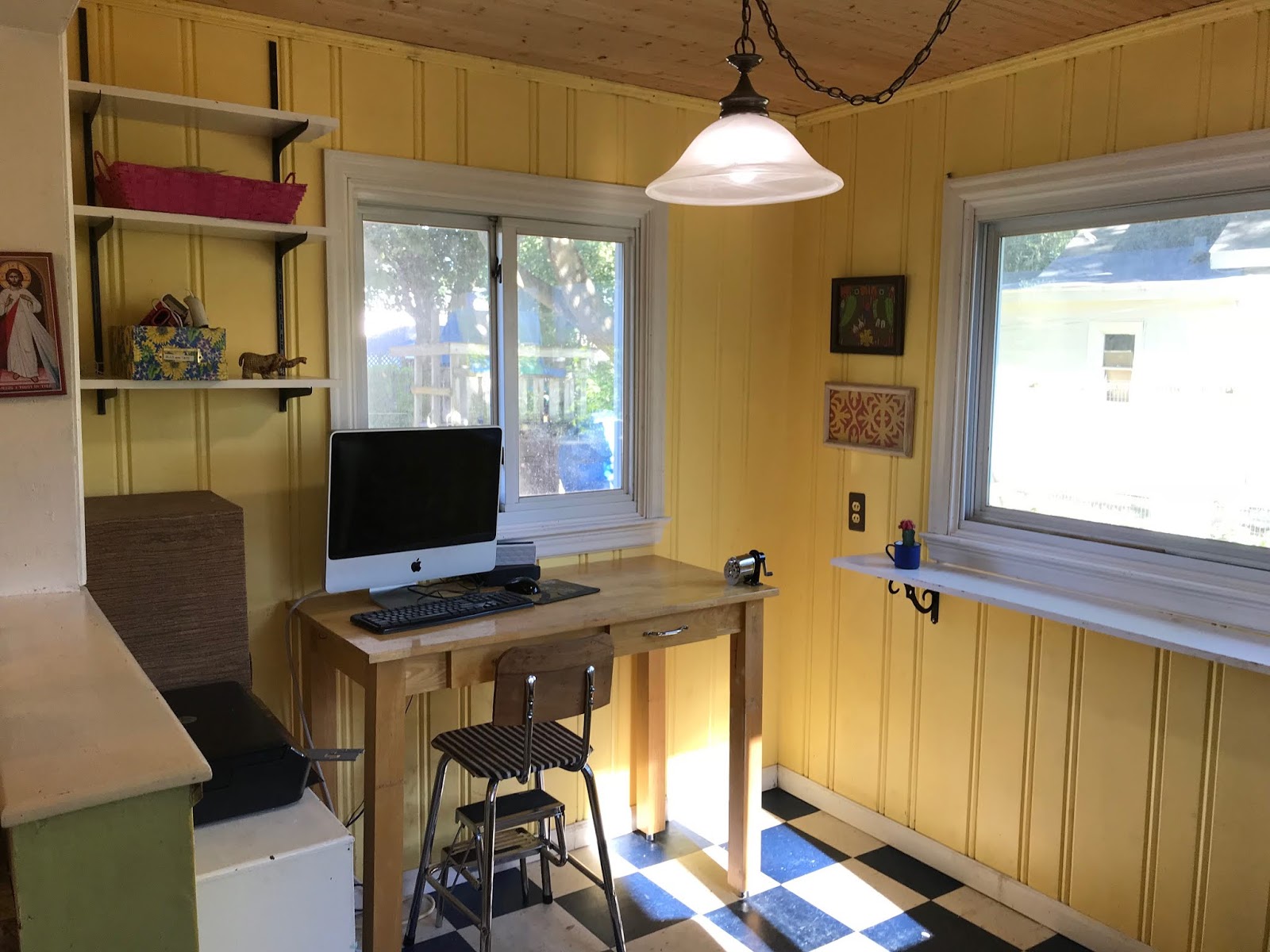 The details. This is a three bedroom, 1600+ sq ft home with a sunroom attached to the kitchen and a bonus room upstairs among the bedrooms that makes a great little office or a bedroom for a baby. The master bedroom is 12x12’ and has a walk-in closet (are rare treat in a 1922 house!) that is about 9x5’. The other two bedrooms are each 11’10”x10’, also with large closets. The bonus room has a window, a ceiling fan light and an outlet as well as shelves and rods for using it as a large walk in closet. The bathroom is a very good size with a real tub good for soaking, and of course a shower. There is a ceramic tile floor. The living room has built in bookshelves that we built, and four huge sunny windows. Hardwood floors are throughout the home and there are cute French doors in the doorway between the immediate entryway and an elegant small entry area where there are extra wide doorways to the living room and dining room and the stairs going up. A charming half bathroom is there where no doubt there was once a hall closet. The dining room is a nice size with room for china cabinets and our family of nine. The kitchen has nice oak cabinets which we have recently painted, abundant storage, new countertops and a huge fridge which stays. Range and dishwasher are newer. The bright sunroom flows from the kitchen and makes a great breakfast area, school area, toy area, computer area, you name it. The basement has the laundry and great storage, a tool bench and tool area and a large finished room, the same size as the living room above. This is currently our girls dormitory, though it does not have egress windows. It does have two west facing windows.